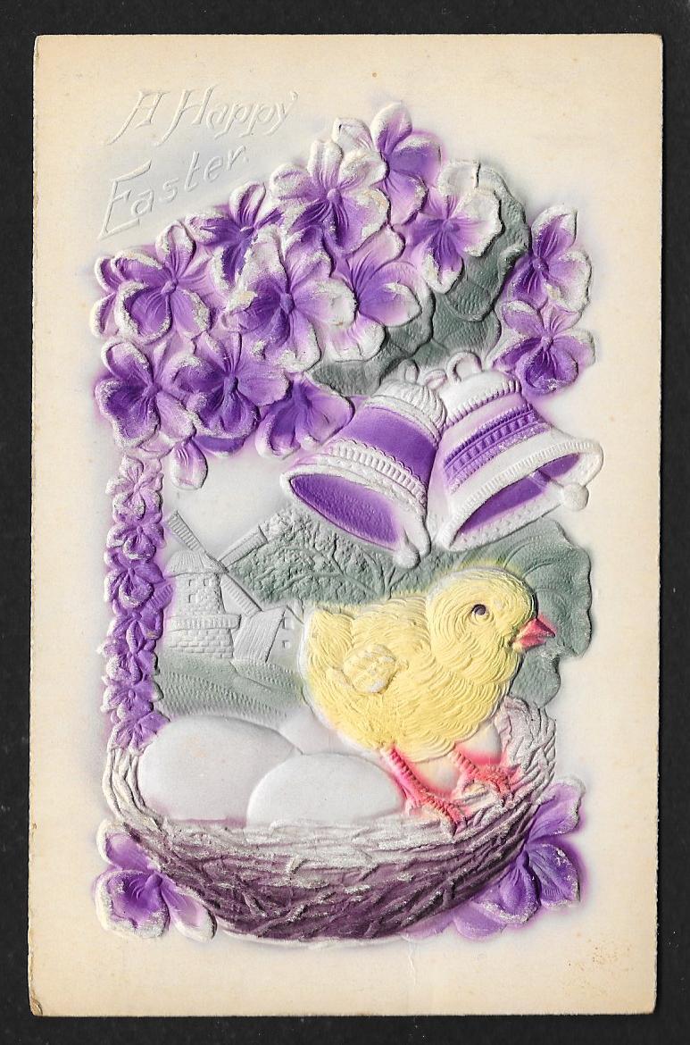 Happy Easter Chick Eggs Bells & Violets Used c1912