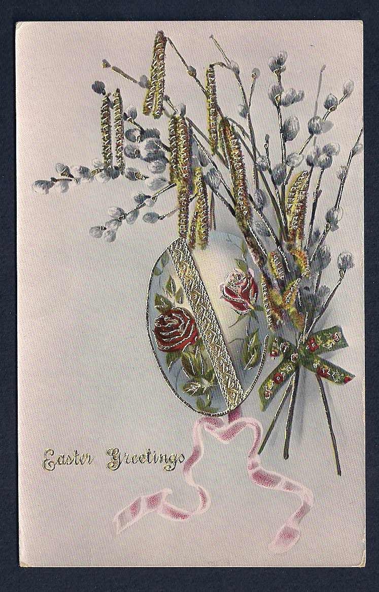Happy Easter Pussy Willows Roses & Egg gel unused c1910's