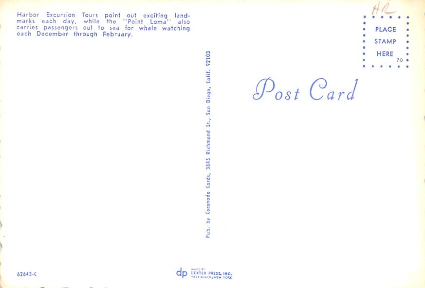Harbor Excursion Tours - San Diego, California Grade: 1 Category: Continental Size Postcard, Approx 4 in x 6 in (10 cm x 15.25 cm) Product Size: Continental size: 4X6 inches (10.5 cm x 15 cm) Grading Scale: Gr ... Read More