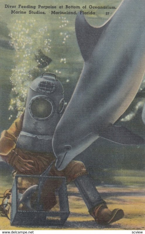 Hard Hat Diver & Dolphin , Marineland , Florida , 30-40s :: Postcard , 3.5 by 5.5" , Linen