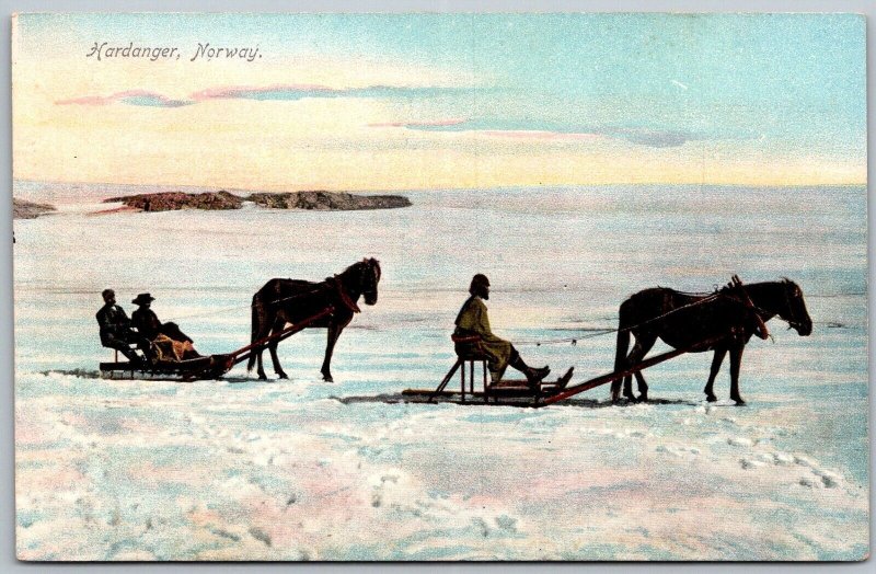 Hardanger Norway 1908 Postcard Horses Pulling Sleds Winter Snow Ice