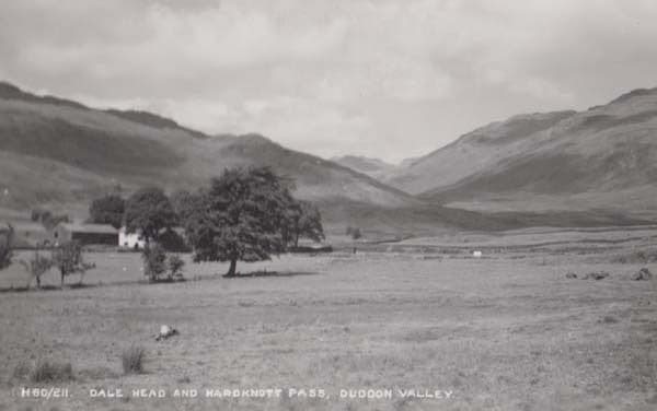 bw8 Undated but appears 60-70 years ago origin postcard of Hardknott Pass & Dale Head in Duddon Valley in the Lake District and a fascinating rural view unused and prestine