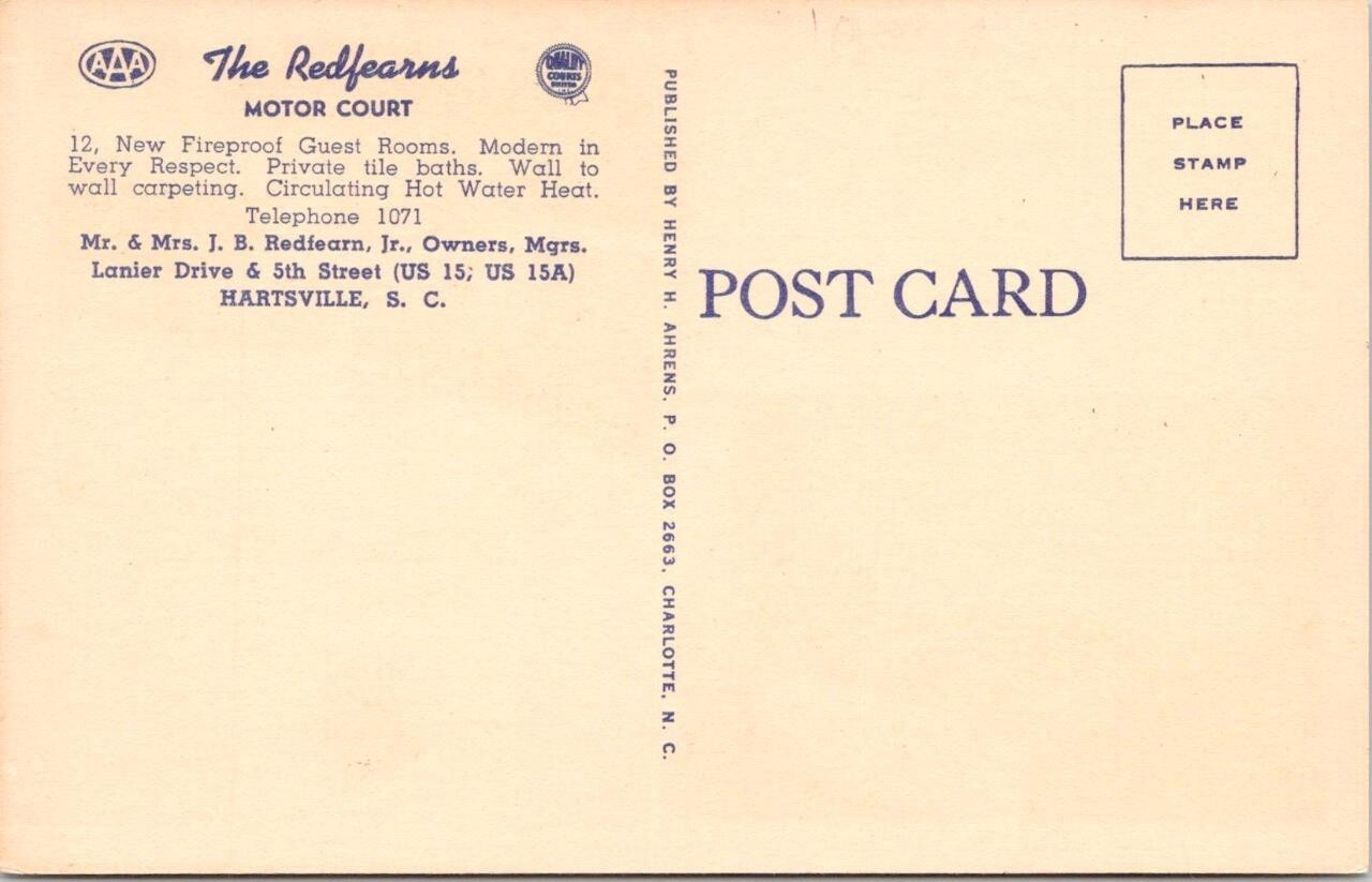 Hartsville, SC South Carolina REDFEARN'S MOTOR COURT Roadside Motel Postcard