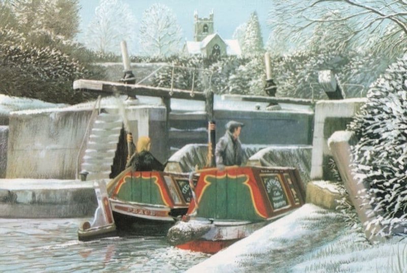 bg216 A rare 1993 postcard of this local view of Hatton Locks in Ice weather (see the ice everywhere) details on reverse postally unused and pristine.