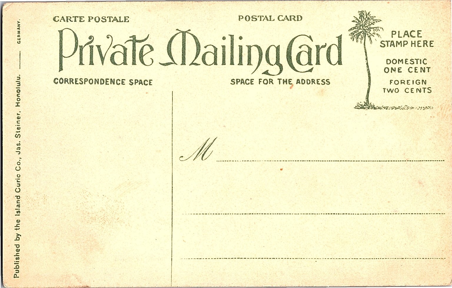 This vintage postcard features a beautifully detailed lithograph of mango fruits from the Hawaiian Islands. Printed in the early 1900s, it showcases rich, natural colors and intricate shading typical of lithographic printing techniques from that era. The image captures the tropical essence of Hawaii, making it a charming collectible for enthusiasts of botanical or Hawaiian memorabilia.Published by the Island Curio Co., Jas. Steiner, Honolulu, and printed in Germany, this postcard reflects the early 20th-century postcard style with its private mailing card format. The back includes a palm tree illustration and postage rates from the period, adding to its historical significance. A must-have for collectors interested in Hawaiian history, vintage fruit illustrations, and early American postcards.