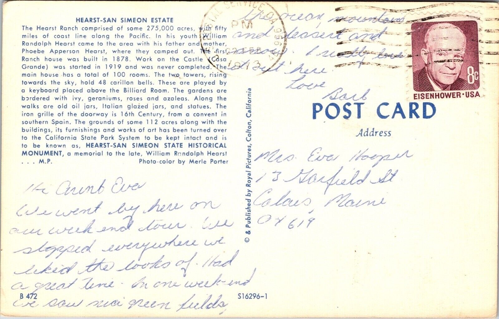 Hearst san simeon estate ranch historical monument wob note postcard