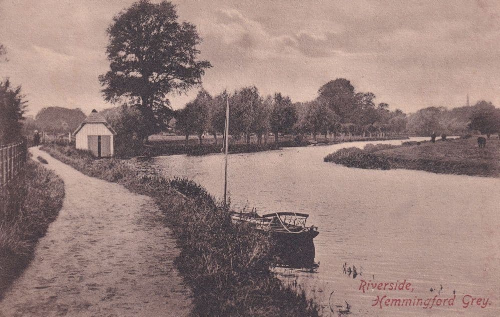 bg369 Antique postcard circa 1905 showing a boat resting for the afternoon at Hemingford Grey in this beautiful river view unused a little aged otherwise great condition.