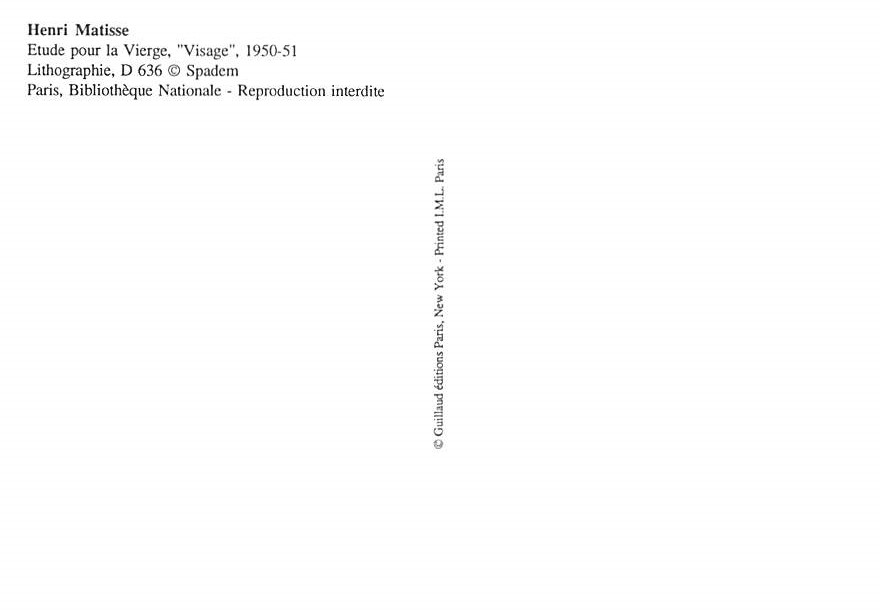Henri Matisse - Visage Grade: 1 Category: Continental Size Postcard, Approx 4 in x 6 in (10 cm x 15.25 cm) Product Size: Continental size: 4X6 inches (10.5 cm x 15 cm) Grading Scale: Grade 1 = Perfect corners G ... Read More