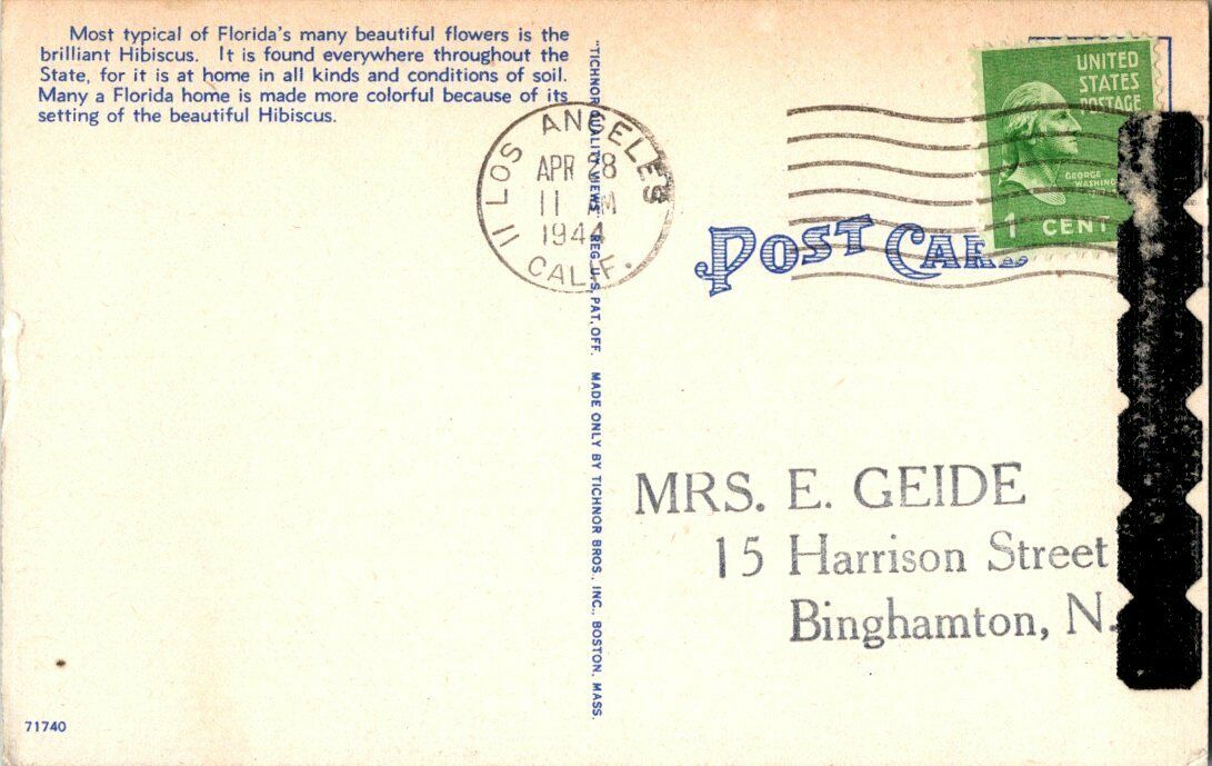 Mailed, Showing Wear From Handling. Writing On The Back. Reasonable Offers Always Considered. Black Residue On The Back. Hibiscus Blooming Florida Vintage Postcard Standard View Card Postmarked 1944 Reasonable ... Read More
