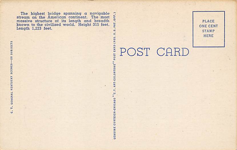 High Bridge Kentucky Postcard Postal Date: Unused Grade: 2 Size: Regular Size Postcard - approximately 3 1/2 inch x 5 1/2 inch (9 CM x 14 CM) Grading Scale: Grade 1 = Perfect corners Grade 2 = Very Minimal co ... Read More