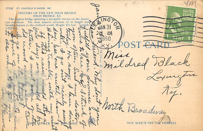 High Bridge Kentucky Postcard Postal Date: 1950 Grade: 1 postal marking on front Size: Regular Size Postcard - approximately 3 1/2 inch x 5 1/2 inch (9 CM x 14 CM) Grading Scale: Grade 1 = Perfect corners Gra ... Read More