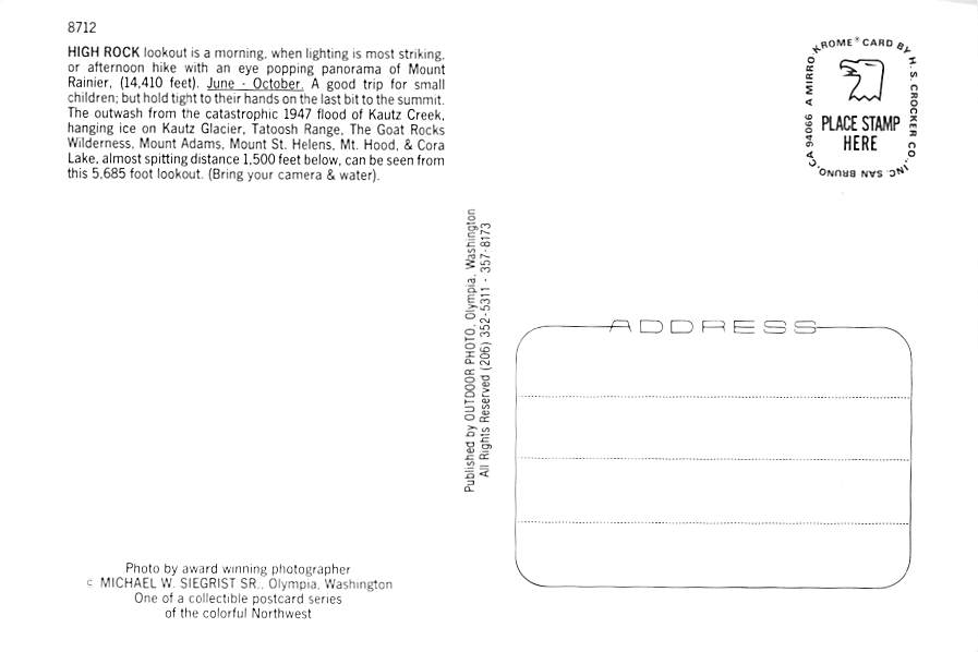 High Rock - Mount Rainier, Washington Grade: 1 Category: Continental Size Postcard, Approx 4 in x 6 in (10 cm x 15.25 cm) Product Size: Continental size: 4X6 inches (10.5 cm x 15 cm) Grading Scale: Grade 1 = P ... Read More