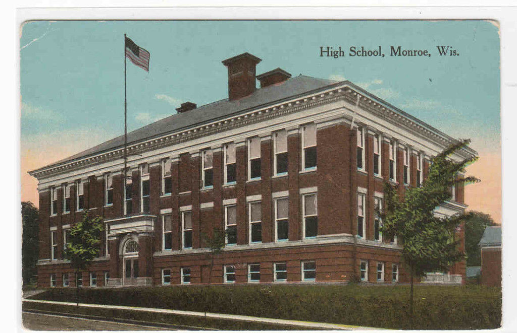 Description: High School Monroe Wisconsin 1910c postcardType: divided back Condition: very good, light corner wear, top left corner small tip crease Any hatched effect is scanner effect, not on actual picture on car ... Read More