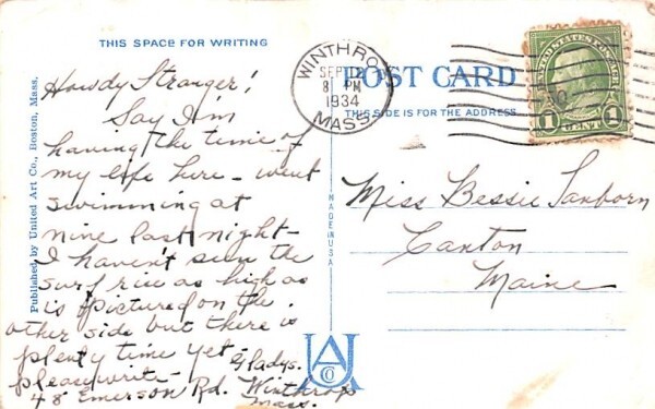 High Surf in Winthrop Beach, Massachusetts Postcard - 1934 Grade: 4 Size: R - Regular size: Approx 3 1/2 X 5 1/2 inch (9 cm X 14 cm) Grading Scale: Grade 1 = Perfect corners Grade 2 = Very Minimal corner wear, ... Read More