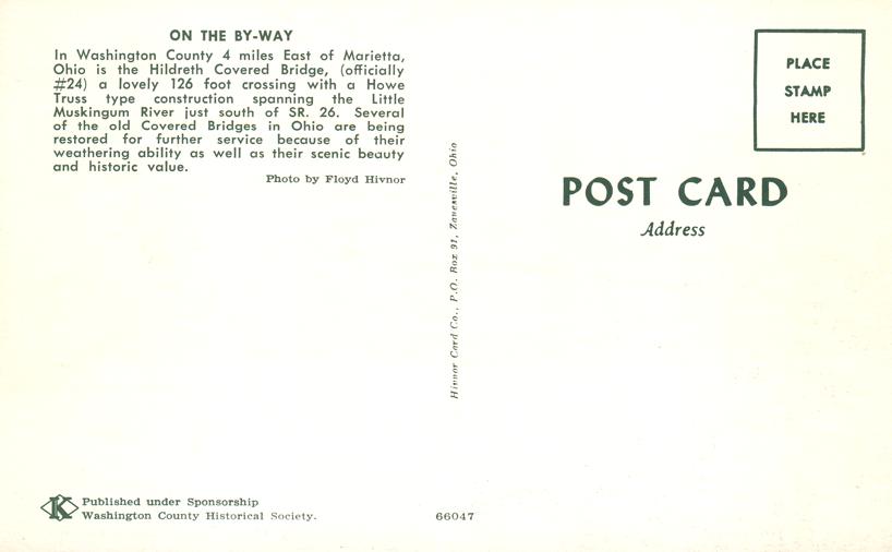 Hildreth Covered Bridge. near Marietta, Washington County, Ohio. Standard sized chrome card. Excellent condition.