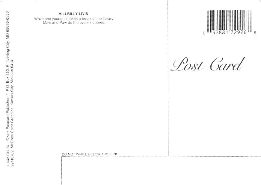 Hillbilly Livin' - Missouri Grade: 1 Category: Continental Size Postcard, Approx 4 in x 6 in (10 cm x 15.25 cm) Product Size: Continental size: 4X6 inches (10.5 cm x 15 cm) Grading Scale: Grade 1 = Perfect cor ... Read More