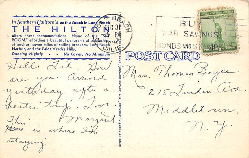 Hilton Hotel Long Beach CA Postcard - 1942 Grade: 2 Size: R - Regular size: Approx 3 1/2 X 5 1/2 inch (9 cm X 14 cm) Grading Scale: Grade 1 = Perfect corners Grade 2 = Very Minimal corner wear, no creases Grad ... Read More