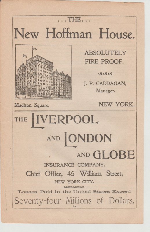 Hoffman House Hotel 1899 Ad, Fire Proof, Madison Square NY, JP Caddagan, Mgr