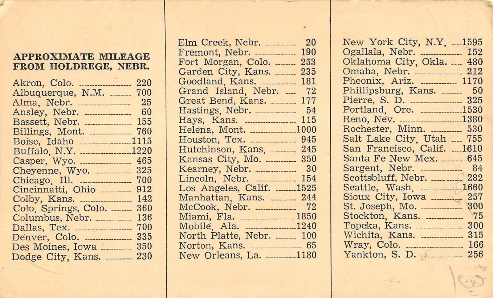 Condition: mileage chart on back, not a postcard, corners bent, thin card, upper left side crease