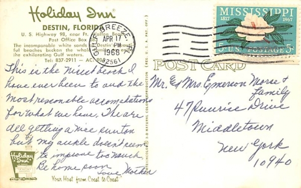 Holiday Inn Destin, Florida Postcard - 1968 Grade: 2 Size: R - Regular size: Approx 3 1/2 X 5 1/2 inch (9 cm X 14 cm) Grading Scale: Grade 1 = Perfect corners Grade 2 = Very Minimal corner wear, no creases Gra ... Read More