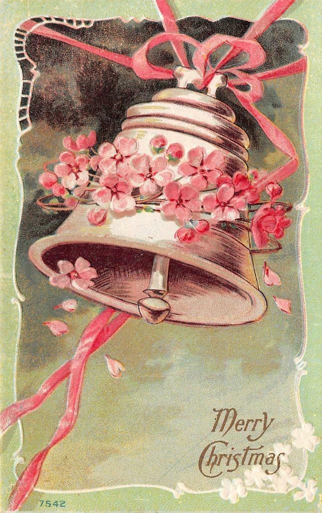 Holiday merry christmas embossed bell & pink flowers c1910's postcard