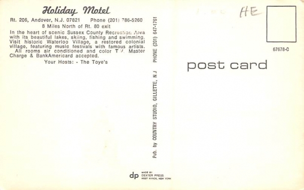 Holiday Motel Andover, New Jersey Postcard Postal Date: Unused Grade: 2 Size: Regular Size Postcard - approximately 3 1/2 inch x 5 1/2 inch (9 CM x 14 CM) Grading Scale: Grade 1 = Perfect corners Grade 2 = Ve ... Read More