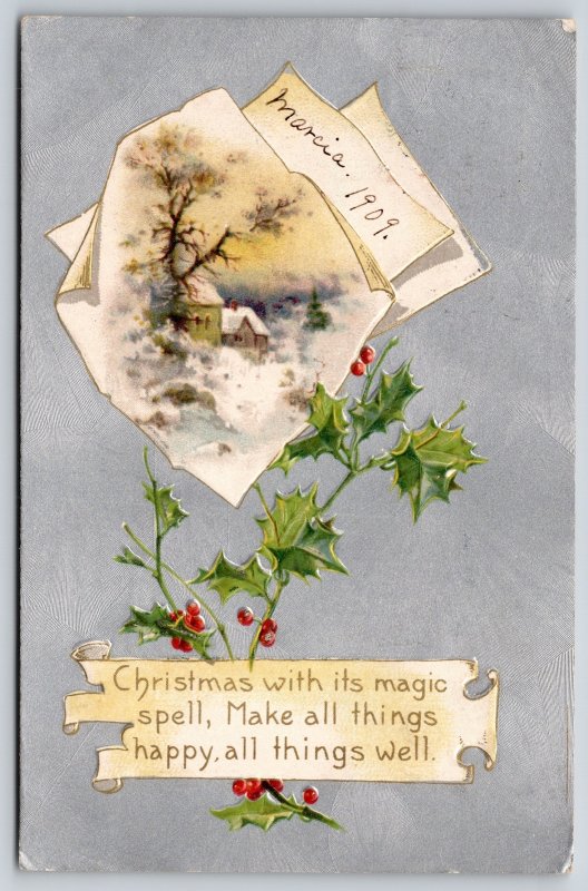 Holiday~Christmas With Its Magic Spell~Holly & Parchment~Emboss~Vintage Postcard