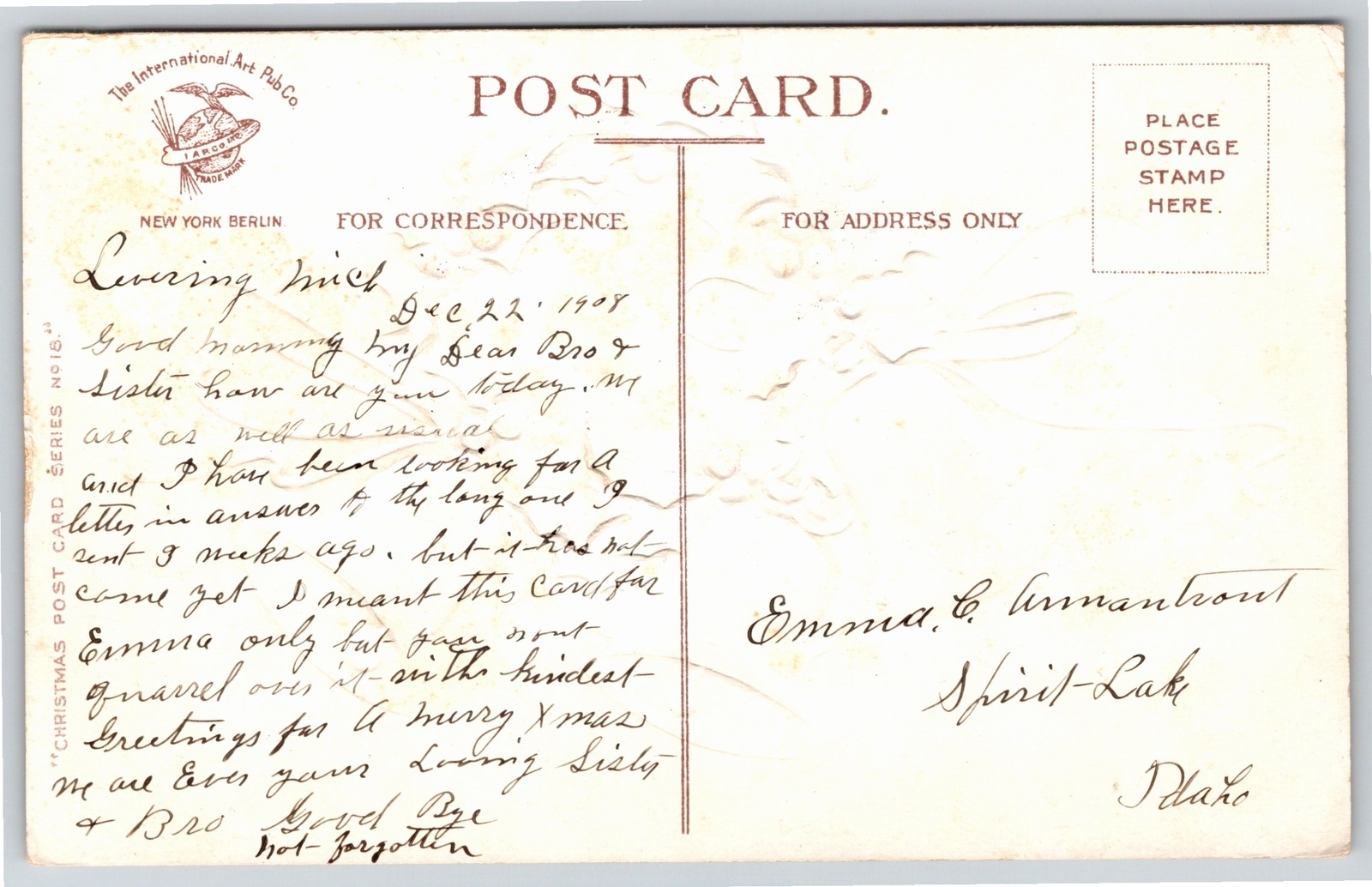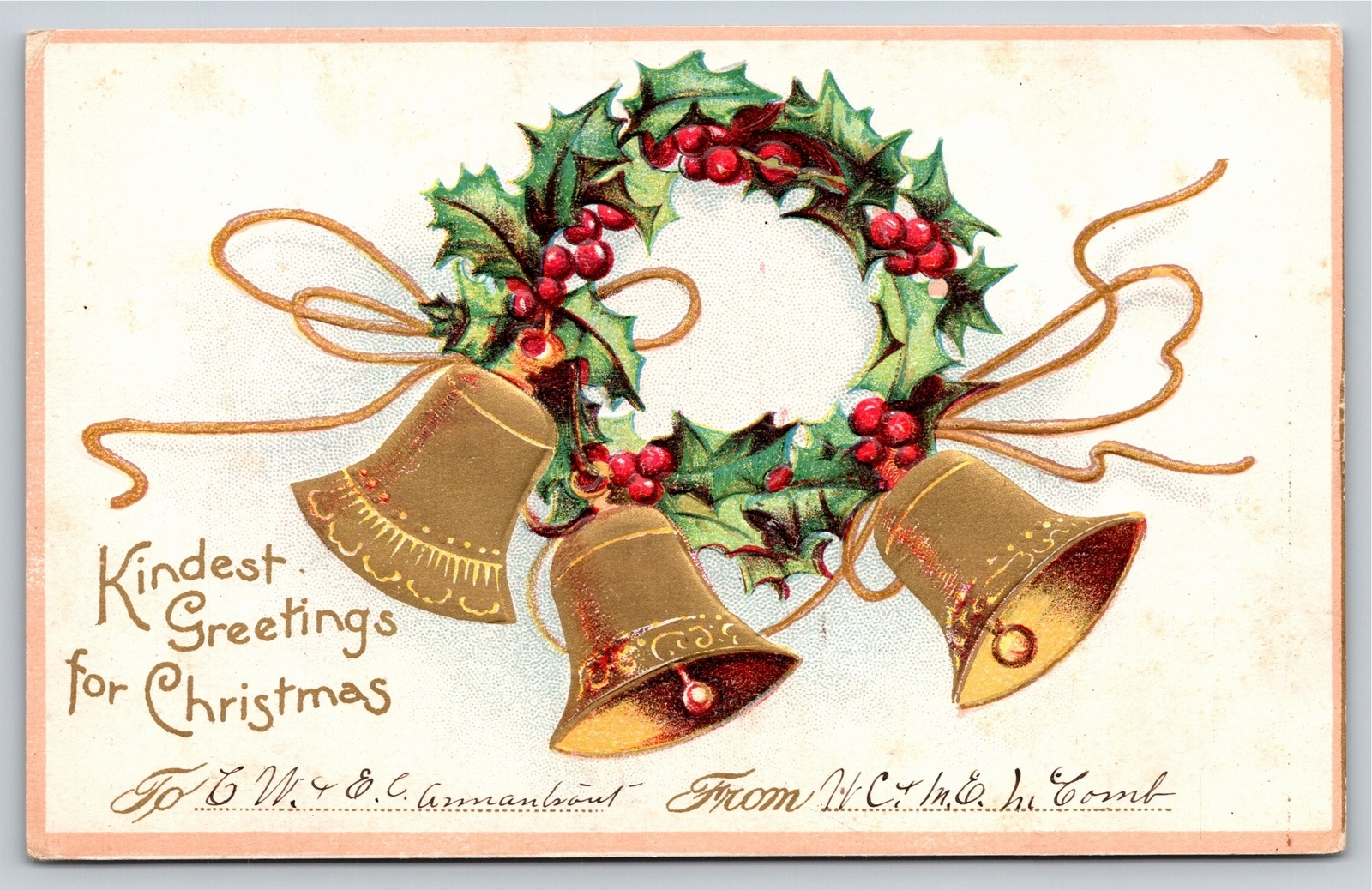 Cartão postal de feriado~Natal~Sinos de ouro na coroa de azevinho~c1910-