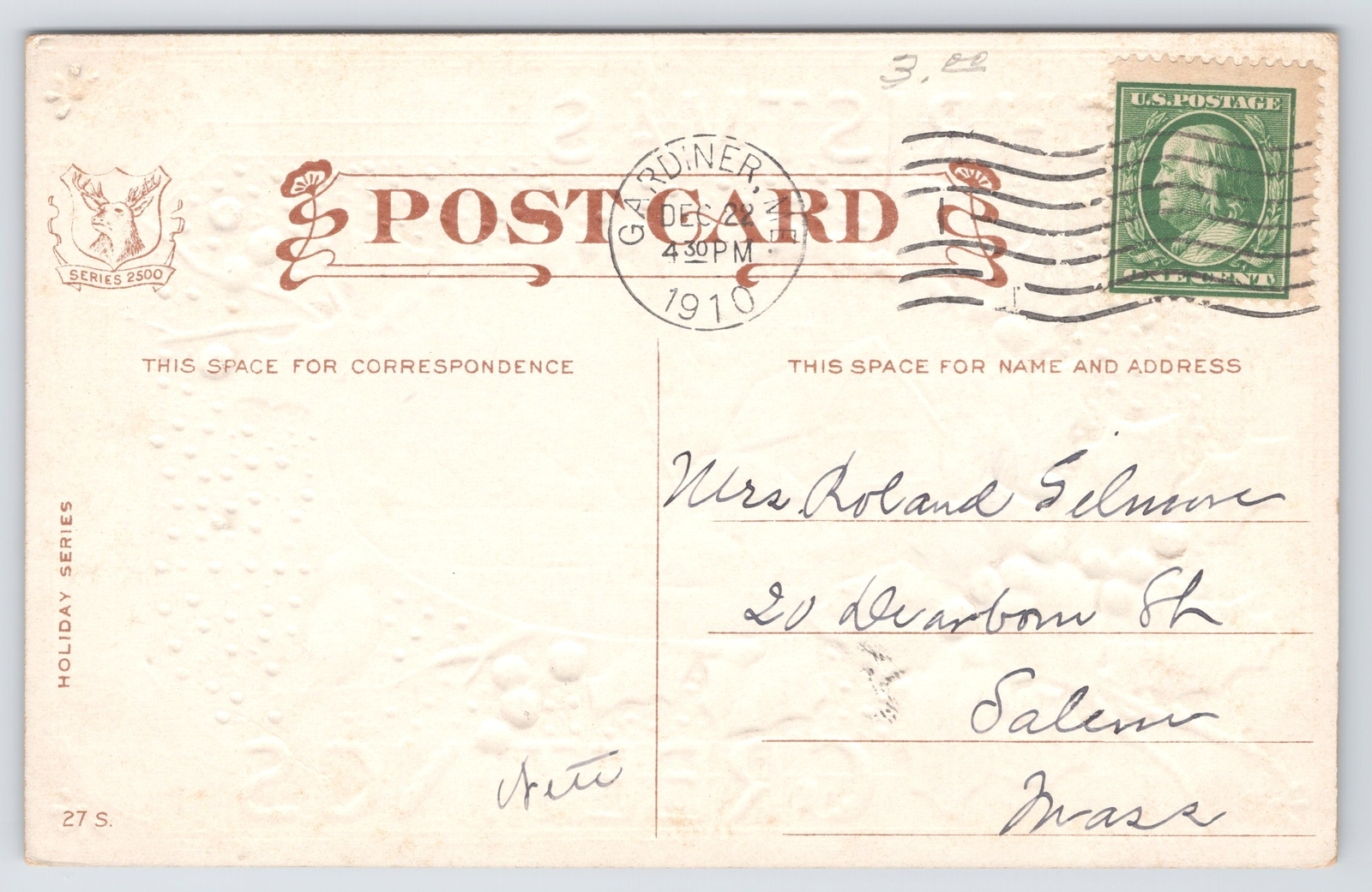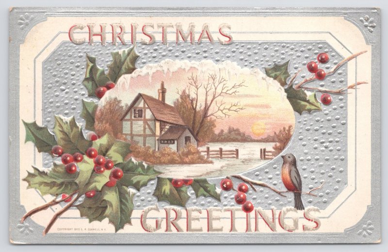 Holiday~Christmas~Home in Winter~Bird on Holly Branch~c1910 Postcard