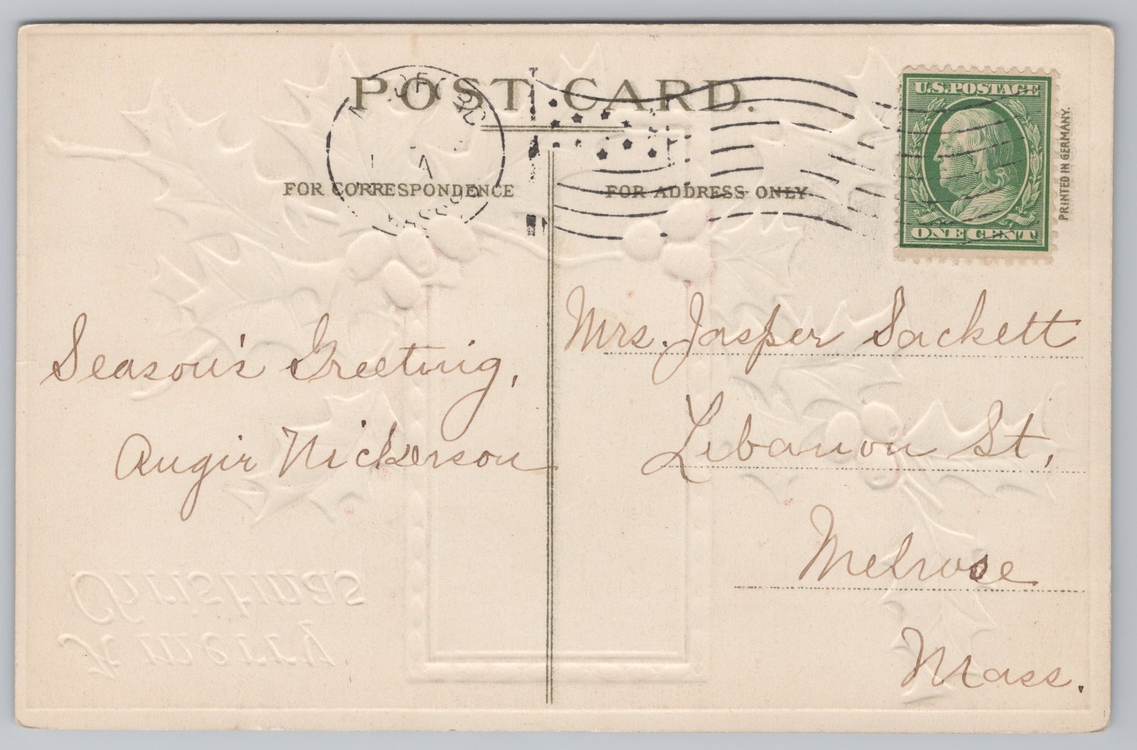 Holiday~Christmas~Houses in Winter~Holly~Vintage Postcard