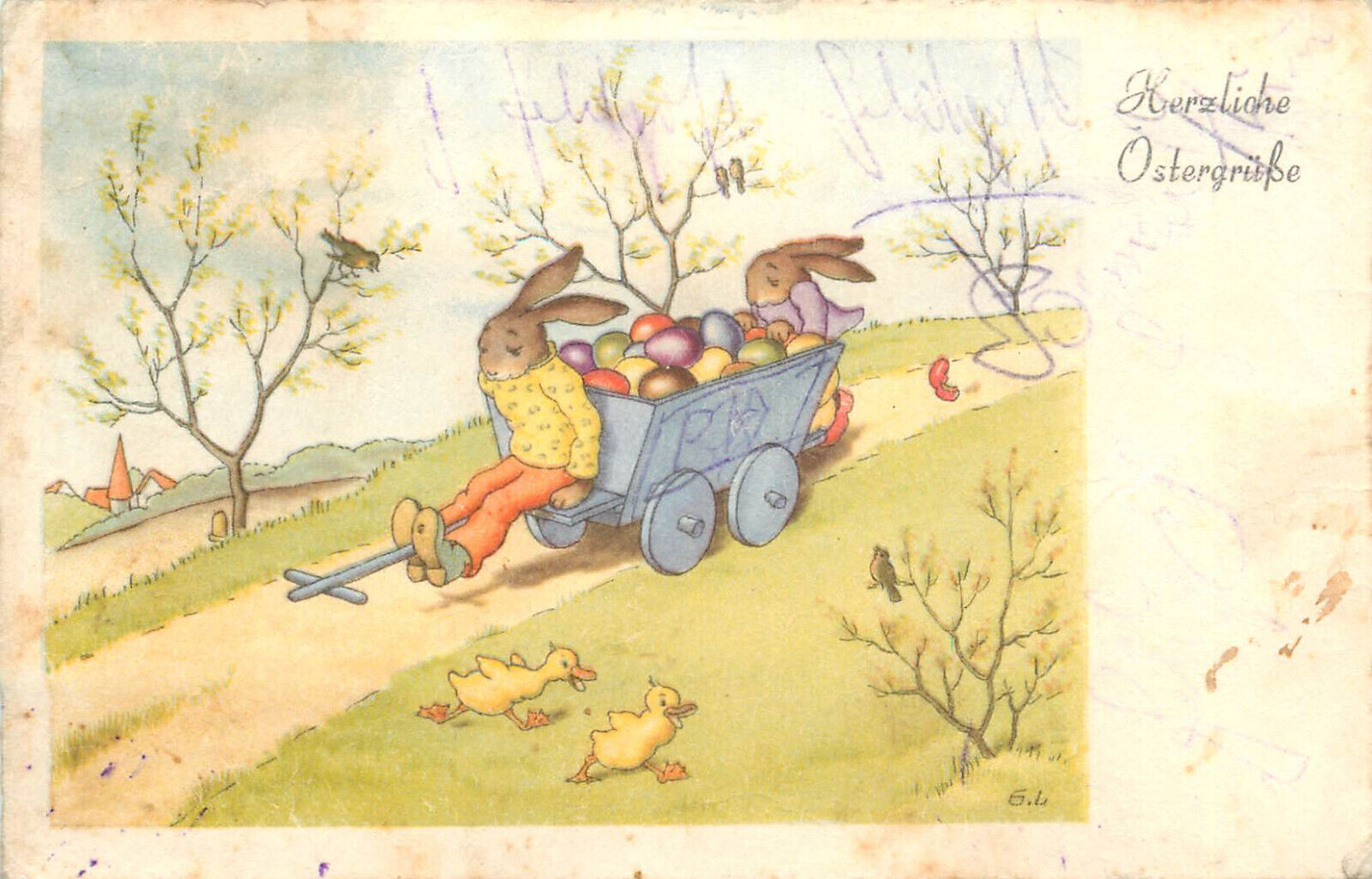 Holidays & celebrations Easter greetings humanized bunny rabbits eggs cart