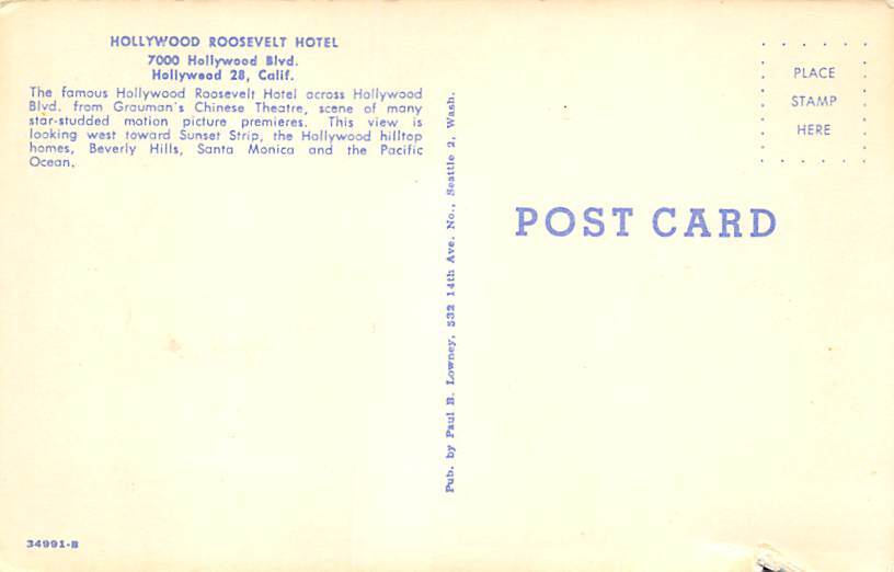 Hollywood Roosevelt Hotel Hollywood CA Postcard - Unused