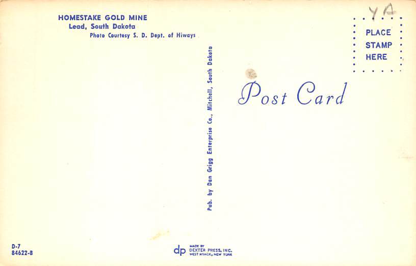 Homestake Goldmine Lead SD Grade: 2 Size: Regular Size Postcard - approximately 3 1/2 inch x 5 1/2 inch (9 CM x 14 CM) Grading Scale: Grade 1 = Perfect corners Grade 2 = Very Minimal corner wear, no creases Gra ... Read More