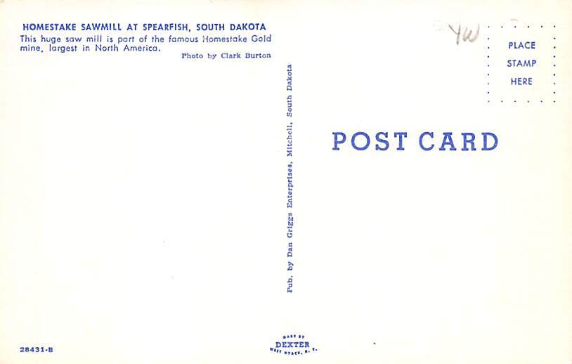 Homestake Sawmill Largest in North America Postal Date: Unused Grade: 1 Size: Regular Size Postcard - approximately 3 1/2 inch x 5 1/2 inch (9 CM x 14 CM) Grading Scale: Grade 1 = Perfect corners Grade 2 = Ve ... Read More
