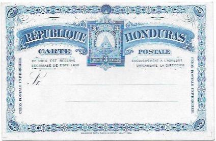 Nice fresh Unused post card from Republic of Honduras. The stamp is 3 centavos. Sides of the card say "Union Postal Universelle". Back of the card is blank. This is a great card.