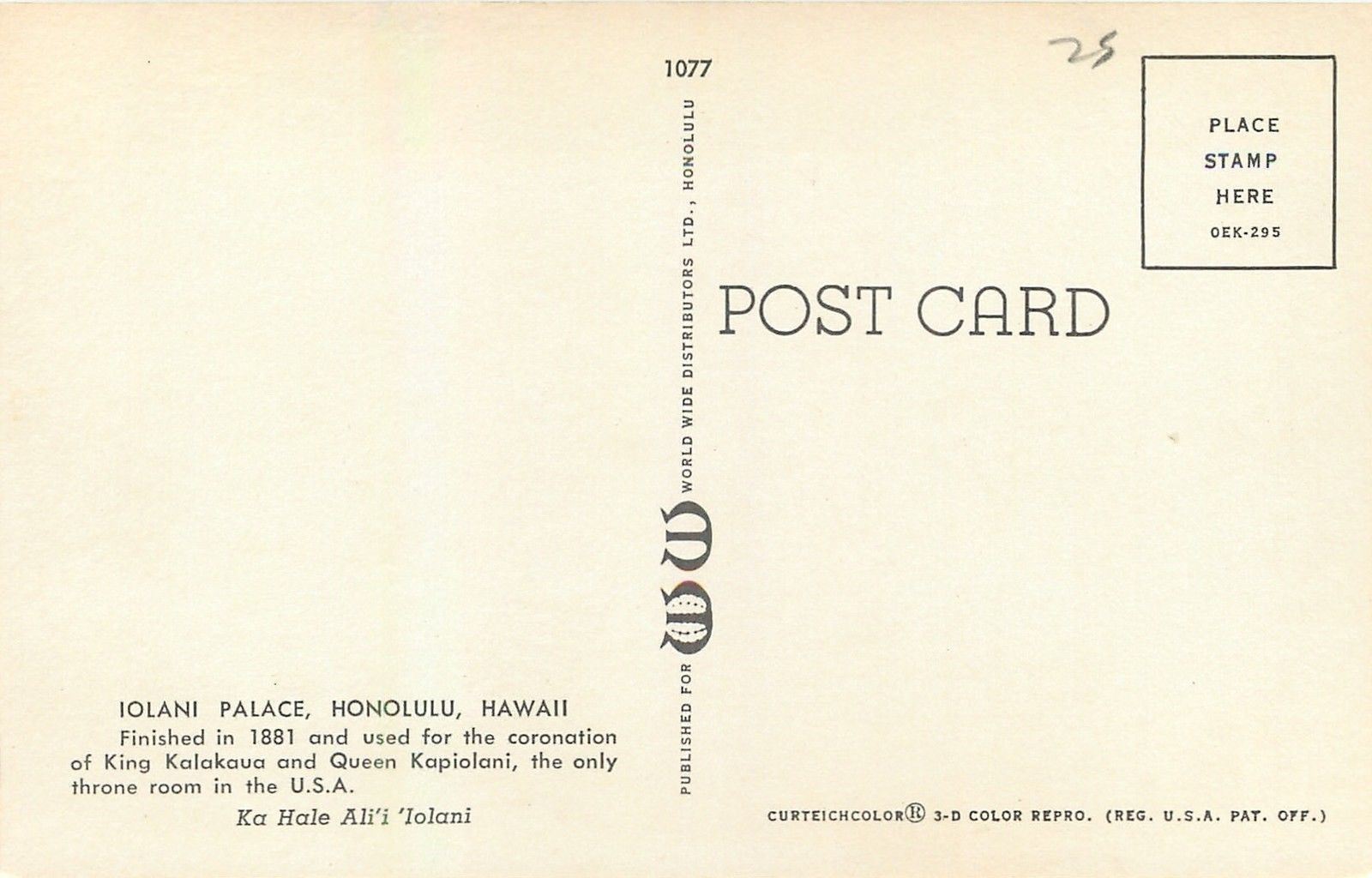 Honolulu Hawaii~Iolani Palace~Inside Out~Throne Room~1970 Postcard