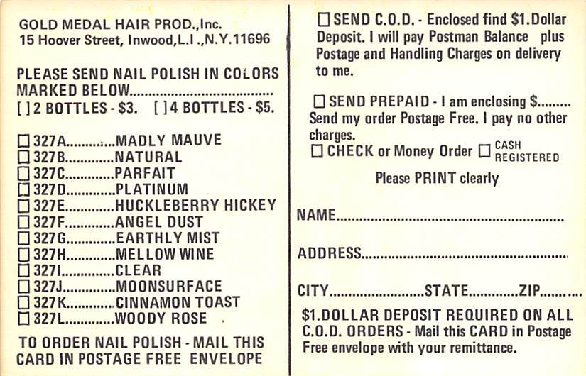 Hot paints for nails Advertising Postcard Unused, Grade: 1, , Size: Regular size: Approx 3 1/2 X 5 1/2 inch (9 cm X 14 cm) Grading Scale: Grade 1 = Perfect corners Grade 2 = Very Minimal corner wear, no crease ... Read More