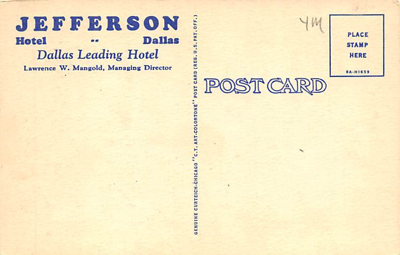Hotel Jefferson - Dallas, Texas TX Postcard - View Images Grade: 2 Size: R - Regular Size Postcard - approximately 3 1/2 inch x 5 1/2 inch (9 CM x 14 CM) Grading Scale: Grade 1 = Perfect corners Grade 2 = Very ... Read More