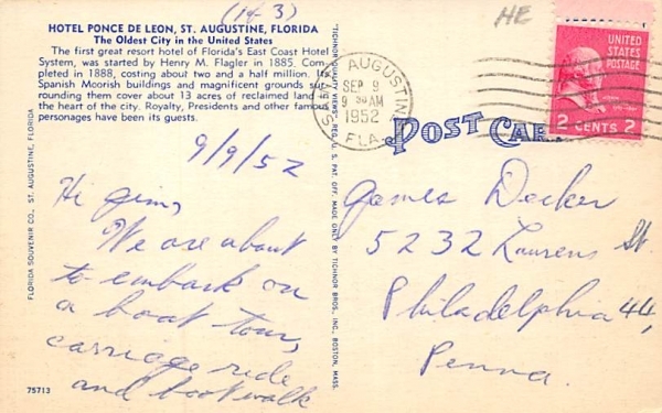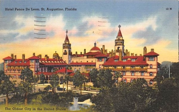 Hotel Ponce De Leon St Augustine, Florida Postcard - 1952 Grade: 1 Size: R - Regular size: Approx 3 1/2 X 5 1/2 inch (9 cm X 14 cm) Grading Scale: Grade 1 = Perfect corners Grade 2 = Very Minimal corner wear, ... Read More