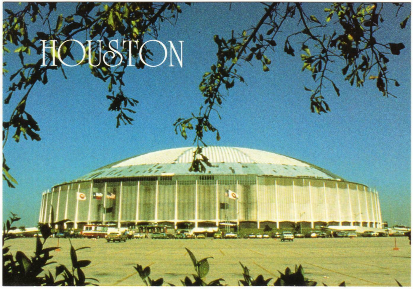 An oversize postcard of the Astrodome in Houston.