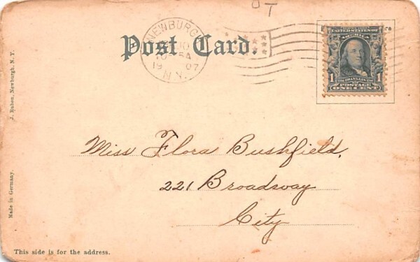 Hudson River in Newburgh, New York Postcard - 1907 Grade: 5 rounded corners Size: R - Regular size: Approx 3 1/2 X 5 1/2 inch (9 cm X 14 cm) Grading Scale: Grade 1 = Perfect corners Grade 2 = Very Minimal corn ... Read More