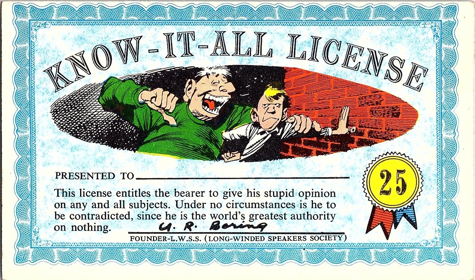 Humorous "Know-It-All License" Nutty Awards Vintage Comic Postcard
