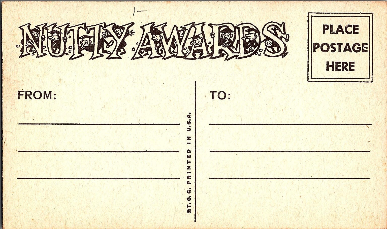 This vintage postcard features a colorful and humorous "Know-It-All License" from the Nutty Awards series, measuring a standard 5.5 x 3.5 inches. The front displays a playful cartoon of two characters, one laughing heartily and the other looking annoyed, with a decorative blue border and a bold "25" award emblem. The text humorously licenses the bearer to give their "stupid opinion on any and all subjects," highlighting the tongue-in-cheek humor typical of novelty postcards. Printed on paper and marked with "©T.C.G. Printed in U.S.A.", this postcard likely dates from mid-20th century, reflecting popular comic and novelty postcard styles. The back features a whimsical "Nutty Awards" title with space for sender and receiver addresses, making it a collectible piece for fans of vintage humor, cartoon art, and Americana ephemera. Its witty theme and colorful design make it a standout addition to any postcard or novelty collection.