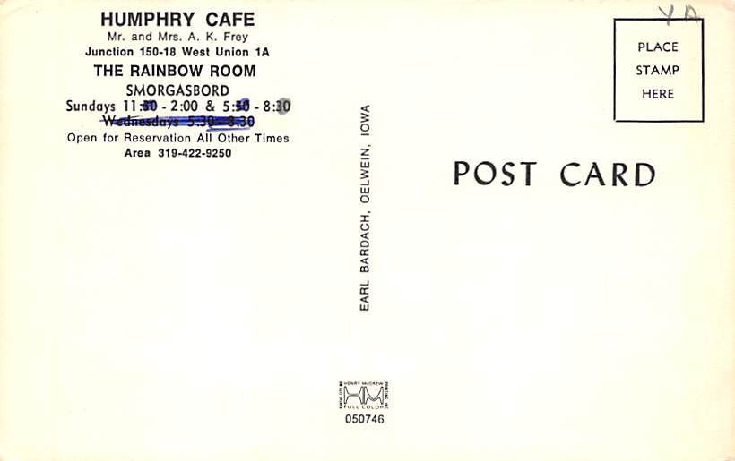 Humphry Cafe Rainbow Room Miscellaneous, Iowa Postcard - Unused