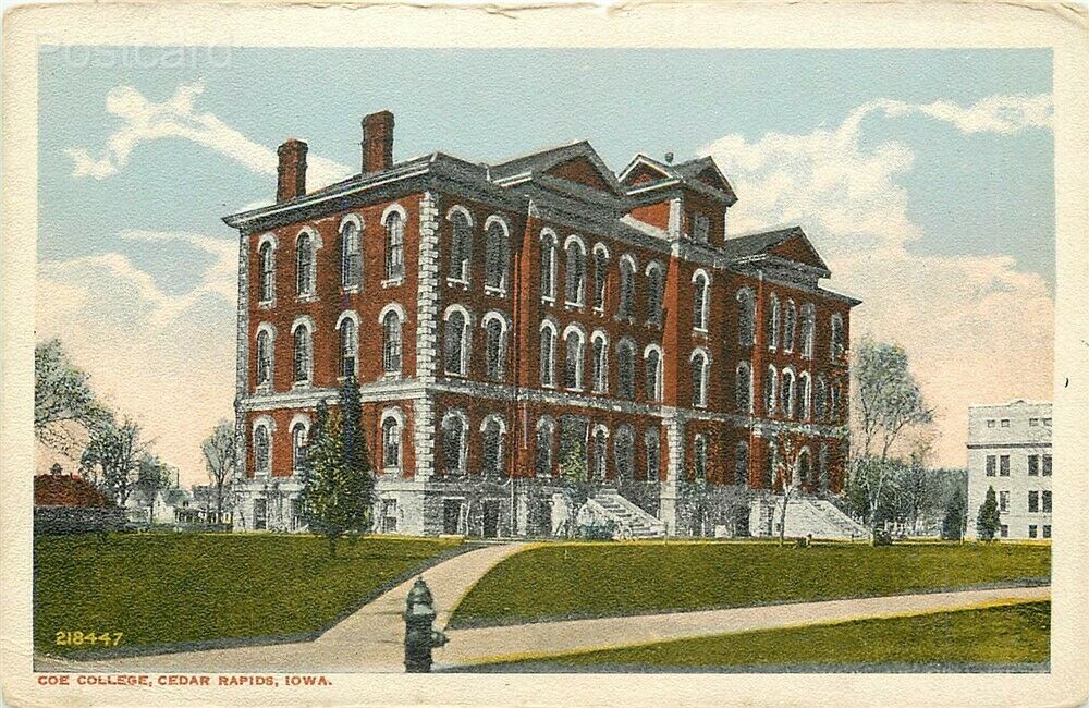 Printed Postcard Cedar Rapids, Iowa, Coe College Publisher/Printer: No. 218447 Postmark: None Image: Nice and clean Corners: Wear Faults/Other: Crease top right corner, edge wear top center to left