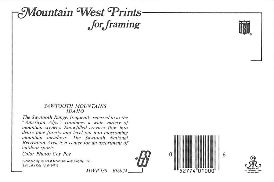 Idaho - Sawtooth Mountains 1 Grading Scale: Grade 1 = Perfect corners Grade 2 = Very Minimal corner wear, no creases Grade 3 = Some corner wear, no creases. Grade 4 = Crease Grade 5 = A lot of damage to card. * Gr ... Read More