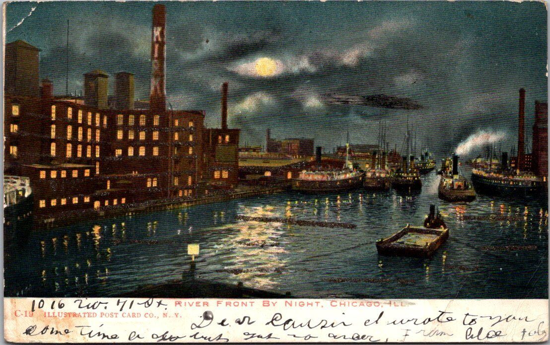 Illinois Chicago River Front By Night 1906