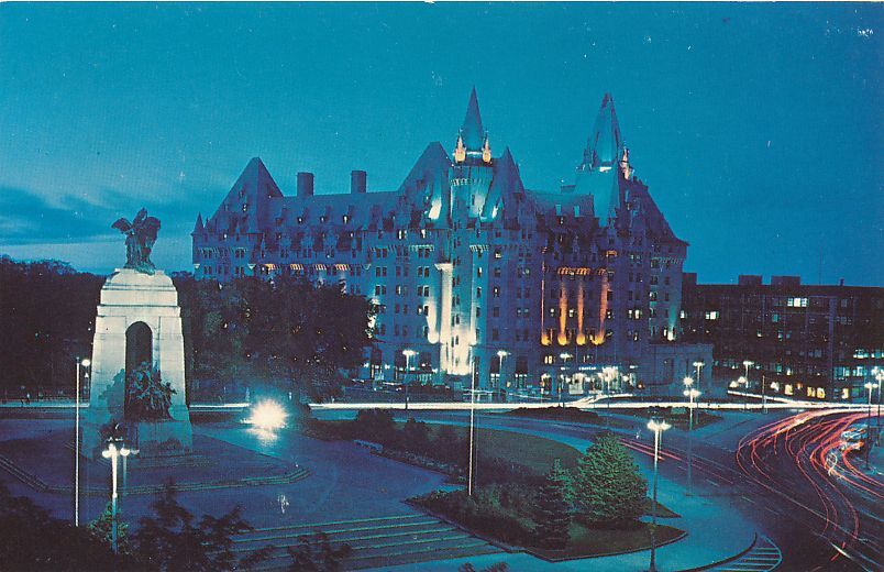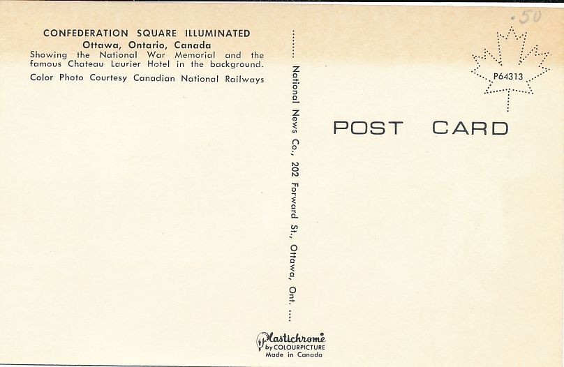 Illuminated Confederation Square at Dusk. Ottawa, Ontario, Canada. Standard sized chrome card. Plastichrome by ColorPicture Publishers. Very good condition.