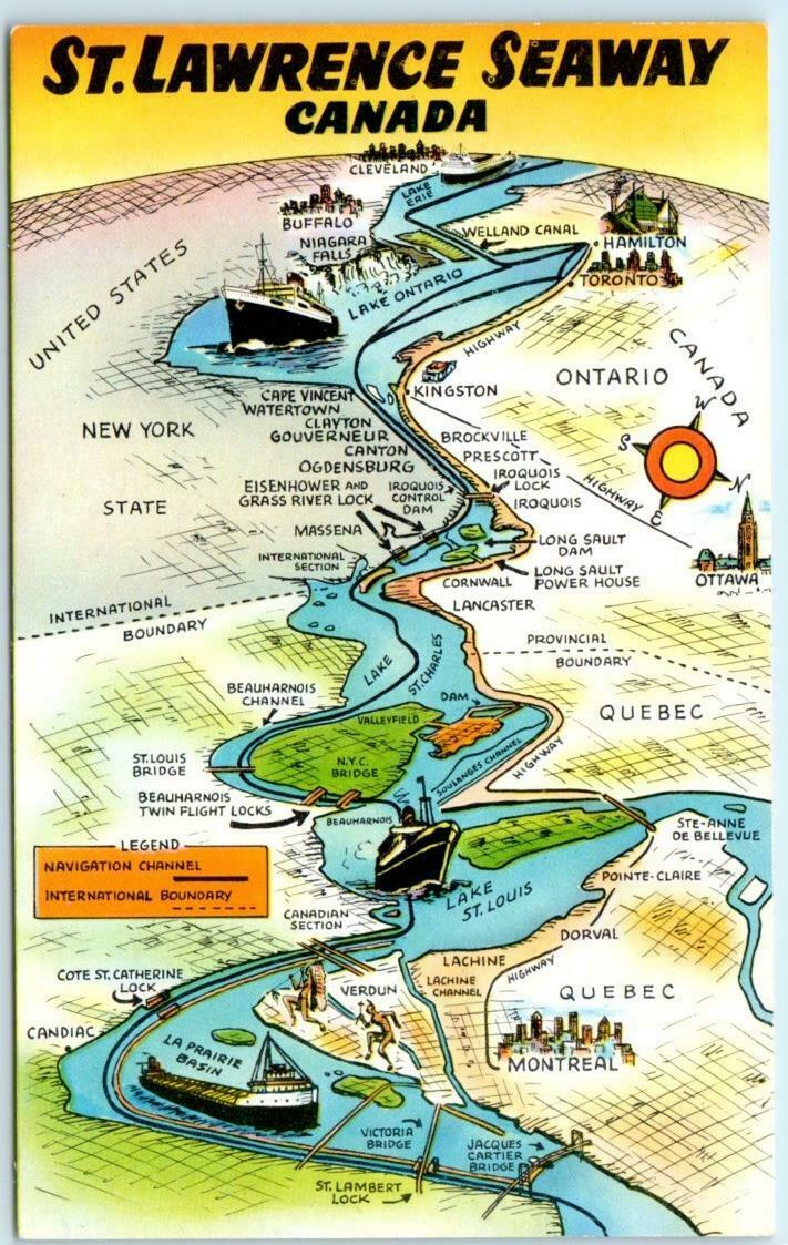 Illustrated Map Postcard ST. LAWRENCE SEAWAY, CANADA Great Graphics ca 1960s