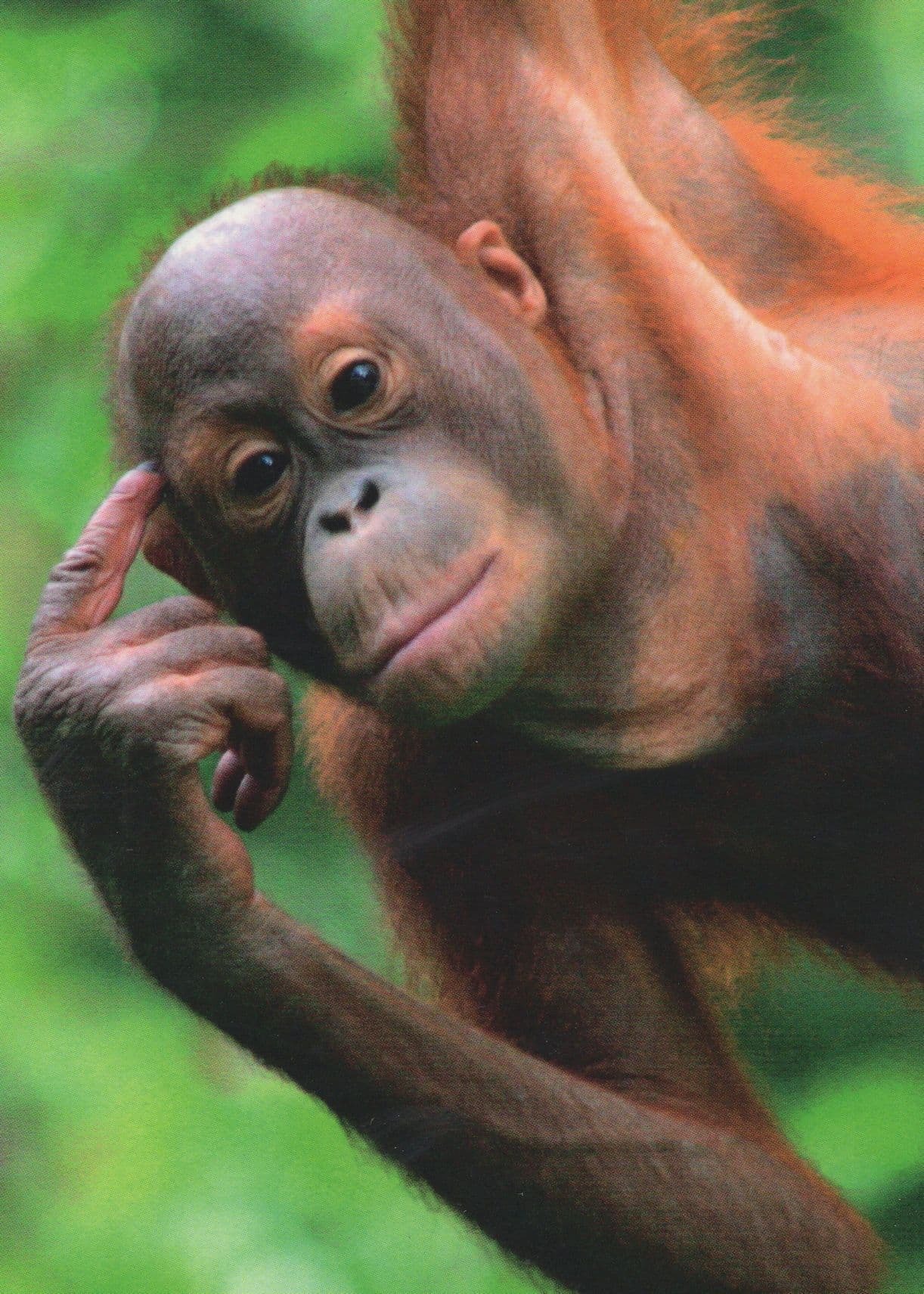 APP - I always aim to seek out the best and most specialist animal postcards from all over the world for my store. This real photo modern postcard was published in Germany and one of the greatest Orangutan postcards I have sourced capturing the monkey pointing at his head almost saying "I'm Clever" as though he is Mensa trained - he looks so intelligent - its a real specialist photographic art postcard of the kind you wont find anywhere and it is unused and mint.